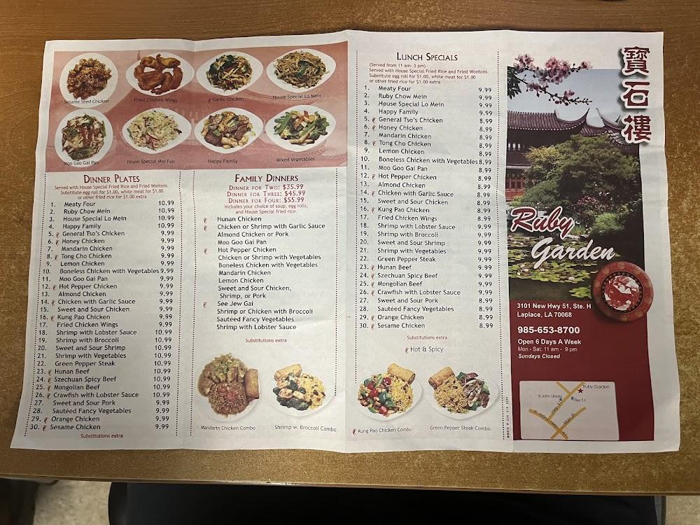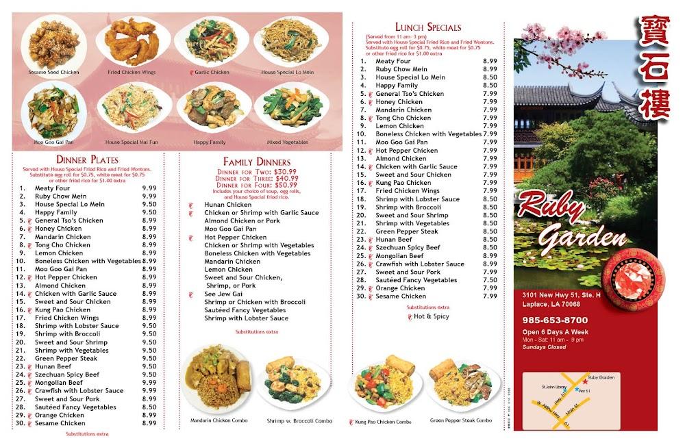 Welcome to Ruby Garden Chinese Restaurant, your go-to destination for classic Chinese-American cuisine in Laplace, LA. Conveniently located at 3101 US-51, we offer a delightful dining experience for families, groups, and solo diners. Enjoy a diverse menu, featuring vegetarian options, small plates for sharing, and delicious desserts, all in a relaxed and inviting atmosphere. Our quick service ensures you won't wait long for your meal, whether dining in, picking up, or enjoying delivery. Accessible facilities, a full bar, and free Wi-Fi complete the experience. Join us for lunch or dinner and savor the flavors of Ruby Garden!